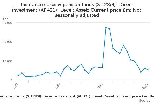 Download this time seriesInsurance corps & pension funds (S.128/9): Direct investment (AF.421): Level: Asset: Current price £m: Not seasonally adjusted