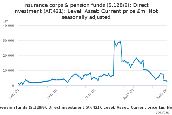 Download this time seriesInsurance corps & pension funds (S.128/9): Direct investment (AF.421): Level: Asset: Current price £m: Not seasonally adjusted