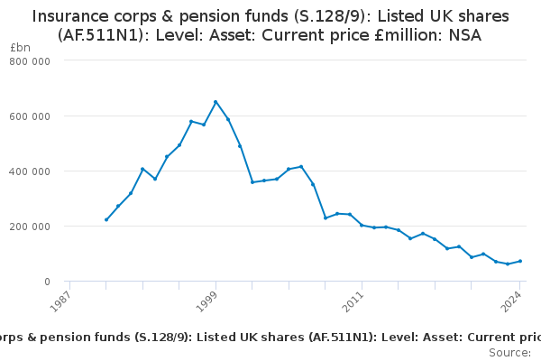 Download this time seriesInsurance corps & pension funds (S.128/9): Listed UK shares (AF.511N1): Level: Asset: Current price £million: NSA