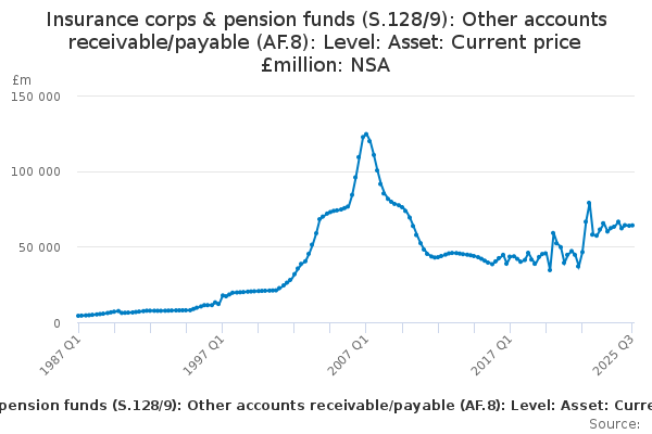 Download this time seriesInsurance corps & pension funds (S.128/9): Other accounts receivable/payable (AF.8): Level: Asset: Current price £million: NSA