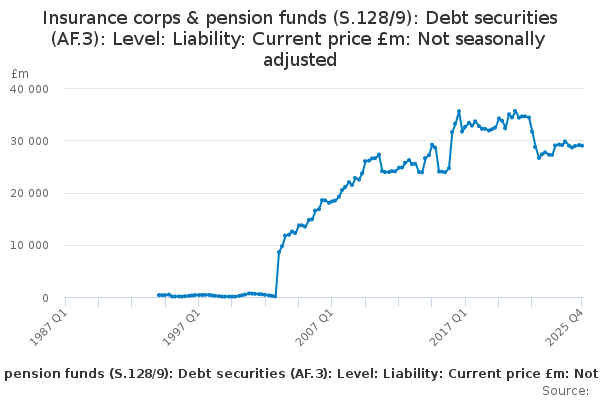 Download this time seriesInsurance corps & pension funds (S.128/9): Debt securities (AF.3): Level: Liability: Current price £m: Not seasonally adjusted