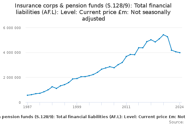 Download this time seriesInsurance corps & pension funds (S.128/9): Total financial liabilities (AF.L): Level: Current price £m: Not seasonally adjusted