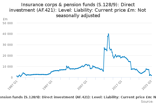 Download this time seriesInsurance corps & pension funds (S.128/9): Direct investment (AF.421): Level: Liability: Current price £m: Not seasonally adjusted