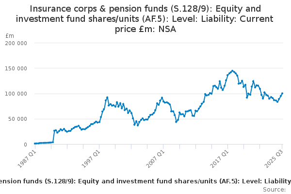 Download this time seriesInsurance corps & pension funds (S.128/9): Equity and investment fund shares/units (AF.5): Level: Liability: Current price £m: NSA