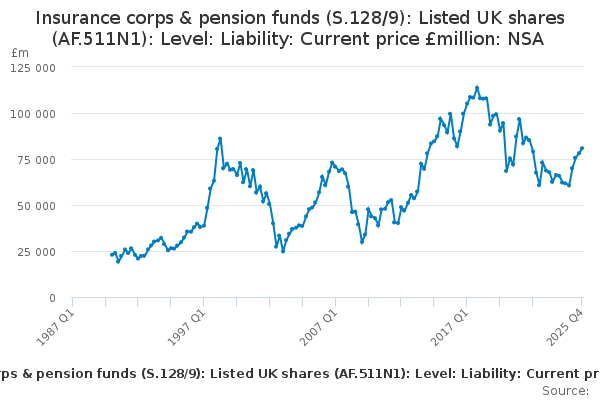 Download this time seriesInsurance corps & pension funds (S.128/9): Listed UK shares (AF.511N1): Level: Liability: Current price £million: NSA