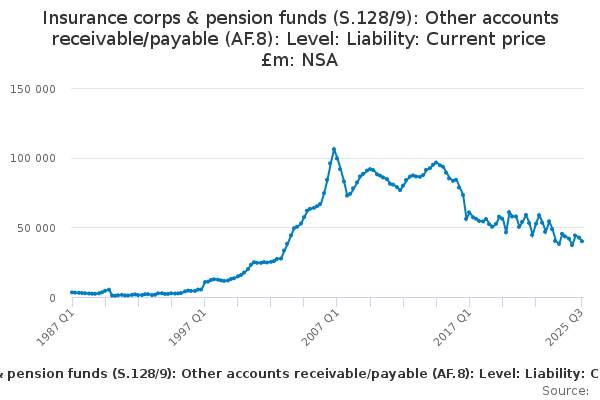 Download this time seriesInsurance corps & pension funds (S.128/9): Other accounts receivable/payable (AF.8): Level: Liability: Current price £m: NSA