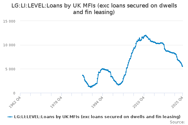 Download this time seriesLG:LI:LEVEL:Loans by UK MFIs (exc loans secured on dwells and fin leasing)