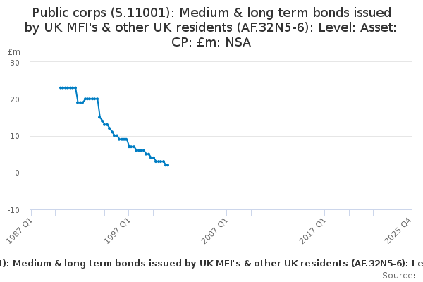 Download this time seriesPublic corps (S.11001): Medium & long term bonds issued by UK MFI's & other UK residents (AF.32N5-6): Level: Asset: CP: £m: NSA