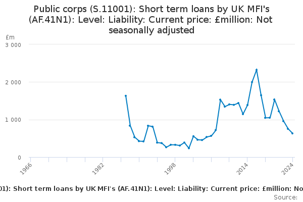 Download this time seriesPublic corps (S.11001): Short term loans by UK MFI's (AF.41N1): Level: Liability: Current price: £million: Not seasonally adjusted