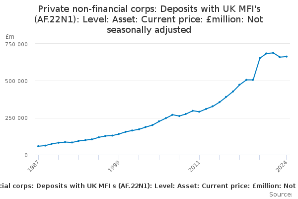 Download this time seriesPrivate non-financial corps: Deposits with UK MFI's (AF.22N1): Level: Asset: Current price: £million: Not seasonally adjusted