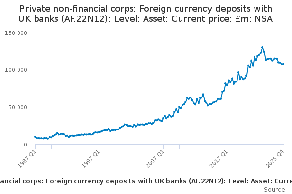 Download this time seriesPrivate non-financial corps: Foreign currency deposits with UK banks (AF.22N12): Level: Asset: Current price: £m: NSA