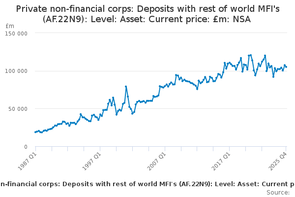 Download this time seriesPrivate non-financial corps: Deposits with rest of world MFI's (AF.22N9): Level: Asset: Current price: £m: NSA
