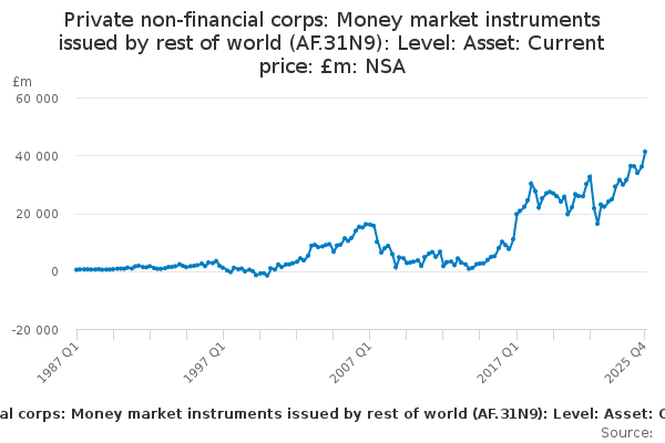 Download this time seriesPrivate non-financial corps: Money market instruments issued by rest of world (AF.31N9): Level: Asset: Current price: £m: NSA