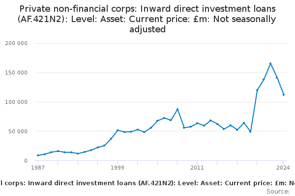 Download this time seriesPrivate non-financial corps: Inward direct investment loans (AF.421N2): Level: Asset: Current price: £m: Not seasonally adjusted
