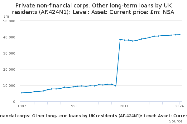 Download this time seriesPrivate non-financial corps: Other long-term loans by UK residents (AF.424N1): Level: Asset: Current price: £m: NSA