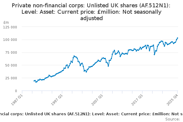 Download this time seriesPrivate non-financial corps: Unlisted UK shares (AF.512N1): Level: Asset: Current price: £million: Not seasonally adjusted