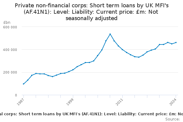 Download this time seriesPrivate non-financial corps: Short term loans by UK MFI's (AF.41N1): Level: Liability: Current price: £m: Not seasonally adjusted