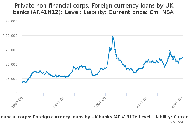 Download this time seriesPrivate non-financial corps: Foreign currency loans by UK banks (AF.41N12): Level: Liability: Current price: £m: NSA
