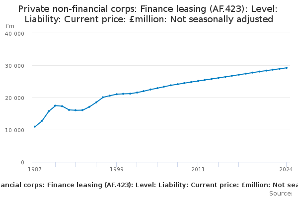 Download this time seriesPrivate non-financial corps: Finance leasing (AF.423): Level: Liability: Current price: £million: Not seasonally adjusted