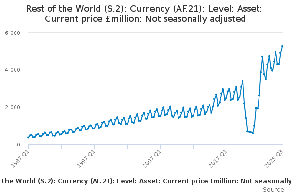 Download this time seriesRest of the World (S.2): Currency (AF.21): Level: Asset: Current price £million: Not seasonally adjusted