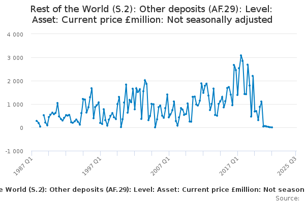 Download this time seriesRest of the World (S.2): Other deposits (AF.29): Level: Asset: Current price £million: Not seasonally adjusted