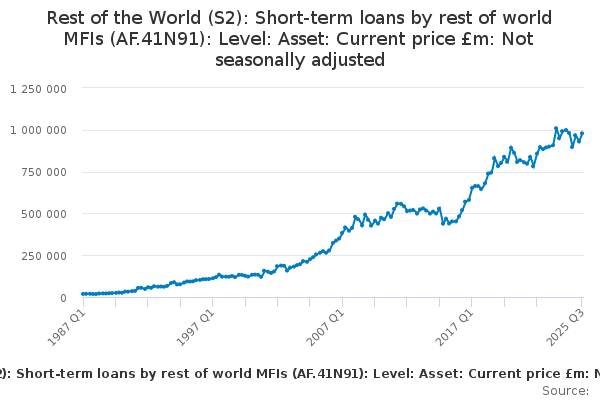Download this time seriesRest of the World (S2): Short-term loans by rest of world MFIs (AF.41N91): Level: Asset: Current price £m: Not seasonally adjusted
