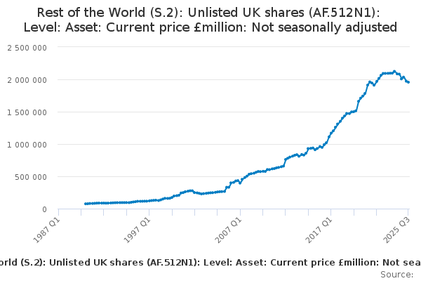 Download this time seriesRest of the World (S.2): Unlisted UK shares (AF.512N1): Level: Asset: Current price £million: Not seasonally adjusted