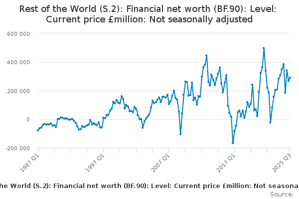 Download this time seriesRest of the World (S.2): Financial net worth (BF.90): Level: Current price £million: Not seasonally adjusted
