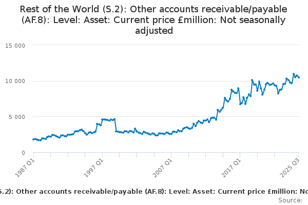 Download this time seriesRest of the World (S.2): Other accounts receivable/payable (AF.8): Level: Asset: Current price £million: Not seasonally adjusted