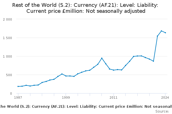 Download this time seriesRest of the World (S.2): Currency (AF.21): Level: Liability: Current price £million: Not seasonally adjusted