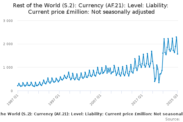 Download this time seriesRest of the World (S.2): Currency (AF.21): Level: Liability: Current price £million: Not seasonally adjusted