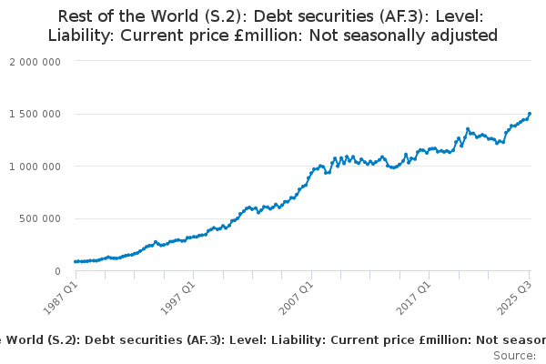 Download this time seriesRest of the World (S.2): Debt securities (AF.3): Level: Liability: Current price £million: Not seasonally adjusted