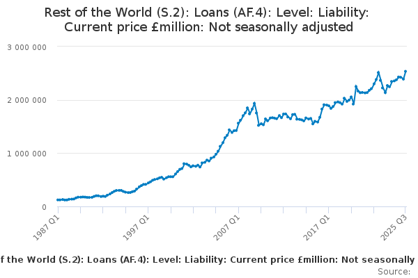 Download this time seriesRest of the World (S.2): Loans (AF.4): Level: Liability: Current price £million: Not seasonally adjusted