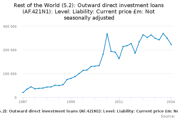 Download this time seriesRest of the World (S.2): Outward direct investment loans (AF.421N1): Level: Liability: Current price £m: Not seasonally adjusted