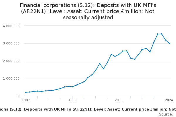 Download this time seriesFinancial corporations (S.12): Deposits with UK MFI's (AF.22N1): Level: Asset: Current price £million: Not seasonally adjusted