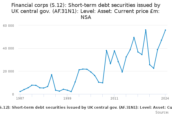 Download this time seriesFinancial corps (S.12): Short-term debt securities issued by UK central gov. (AF.31N1): Level: Asset: Current price £m: NSA