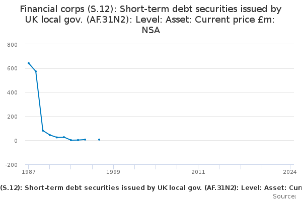Download this time seriesFinancial corps (S.12): Short-term debt securities issued by UK local gov. (AF.31N2): Level: Asset: Current price £m: NSA