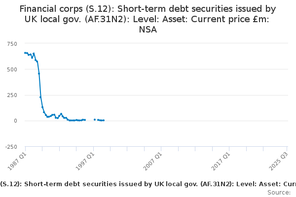 Download this time seriesFinancial corps (S.12): Short-term debt securities issued by UK local gov. (AF.31N2): Level: Asset: Current price £m: NSA