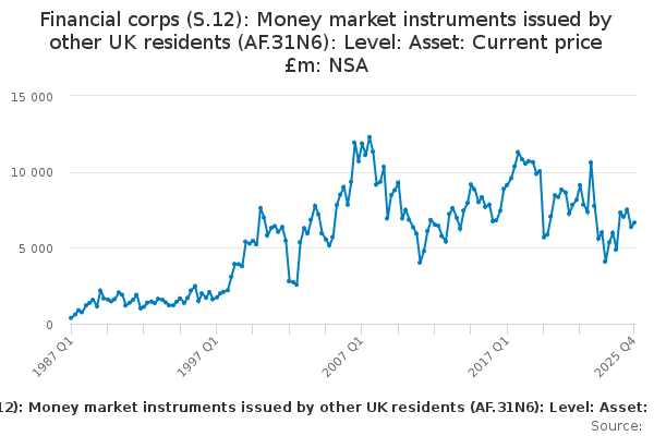 Download this time seriesFinancial corps (S.12): Money market instruments issued by other UK residents (AF.31N6): Level: Asset: Current price £m: NSA