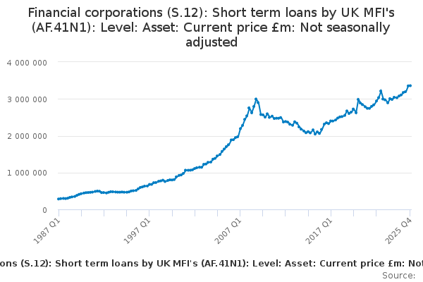 Download this time seriesFinancial corporations (S.12): Short term loans by UK MFI's (AF.41N1): Level: Asset: Current price £m: Not seasonally adjusted