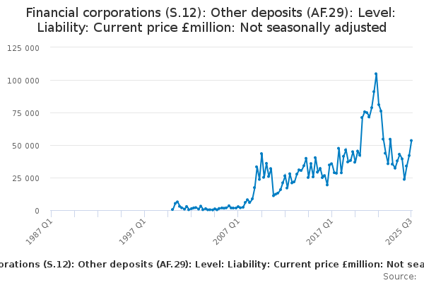Download this time seriesFinancial corporations (S.12): Other deposits (AF.29): Level: Liability: Current price £million: Not seasonally adjusted