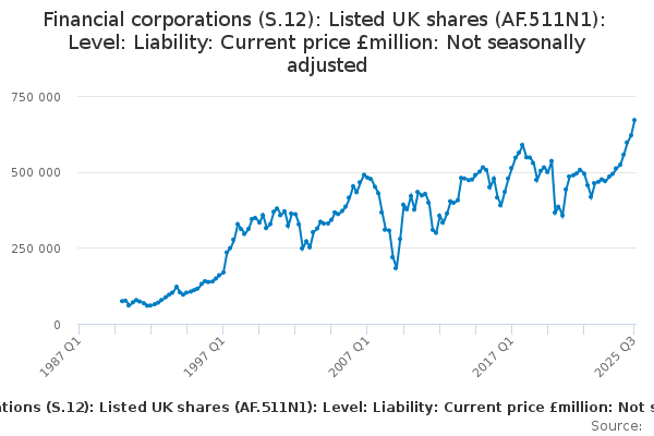 Download this time seriesFinancial corporations (S.12): Listed UK shares (AF.511N1): Level: Liability: Current price £million: Not seasonally adjusted