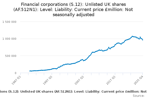 Download this time seriesFinancial corporations (S.12): Unlisted UK shares (AF.512N1): Level: Liability: Current price £million: Not seasonally adjusted