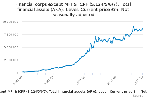 Download this time seriesFinancial corps except MFI & ICPF (S.124/5/6/7): Total financial assets (AF.A): Level: Current price £m: Not seasonally adjusted