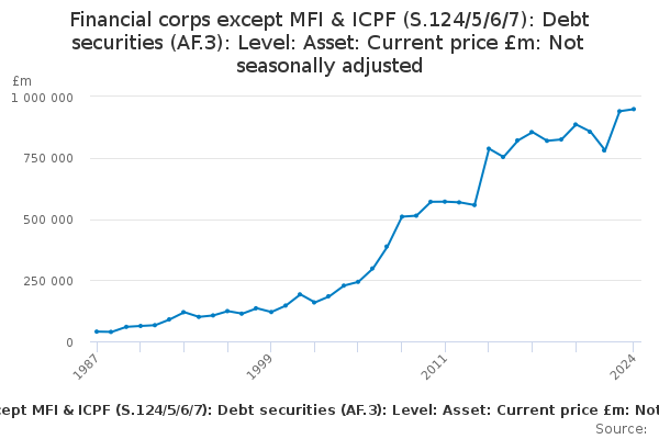 Download this time seriesFinancial corps except MFI & ICPF (S.124/5/6/7): Debt securities (AF.3): Level: Asset: Current price £m: Not seasonally adjusted