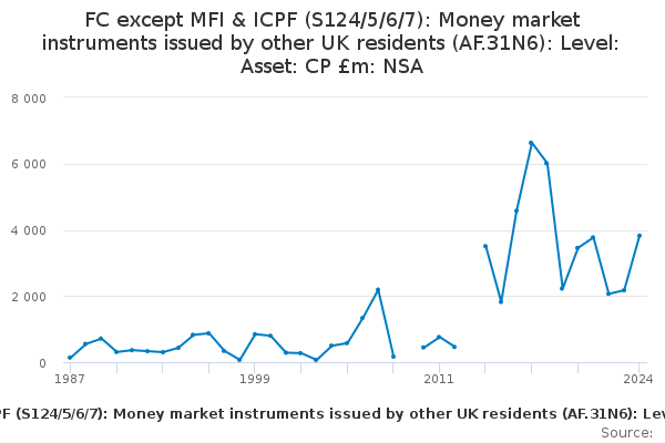 Download this time seriesFC except MFI & ICPF (S124/5/6/7): Money market instruments issued by other UK residents (AF.31N6): Level: Asset: CP £m: NSA