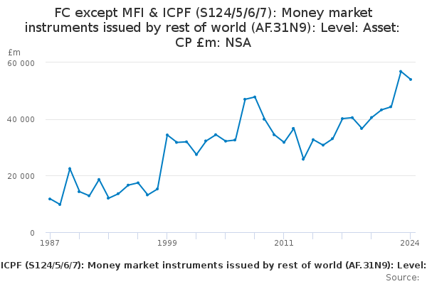 Download this time seriesFC except MFI & ICPF (S124/5/6/7): Money market instruments issued by rest of world (AF.31N9): Level: Asset: CP £m: NSA