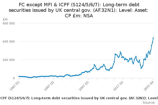 Download this time seriesFC except MFI & ICPF (S124/5/6/7): Long-term debt securities issued by UK central gov. (AF.32N1): Level: Asset: CP £m: NSA