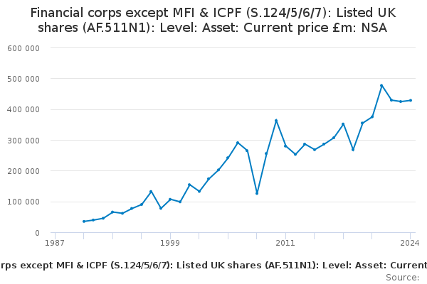 Download this time seriesFinancial corps except MFI & ICPF (S.124/5/6/7): Listed UK shares (AF.511N1): Level: Asset: Current price £m: NSA