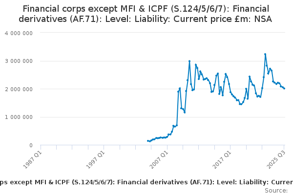 Download this time seriesFinancial corps except MFI & ICPF (S.124/5/6/7): Financial derivatives (AF.71): Level: Liability: Current price £m: NSA
